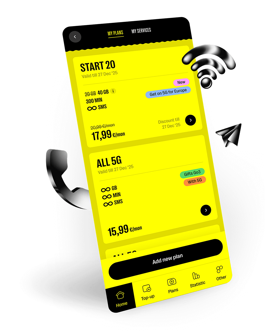 Nepraleisk nuolaidų, matyk MIN, SMS ir GB likučius, užsisakyk planus, paslaugas, duomenų paketus.